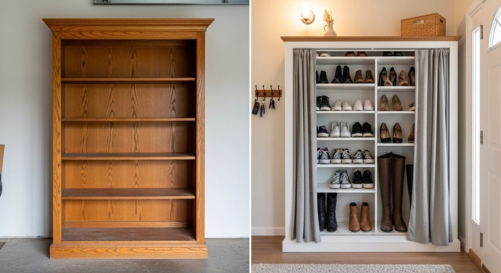 Adding doors or a curtain transforms the open bookcase into concealed storage, ideal for hiding shoe clutter.