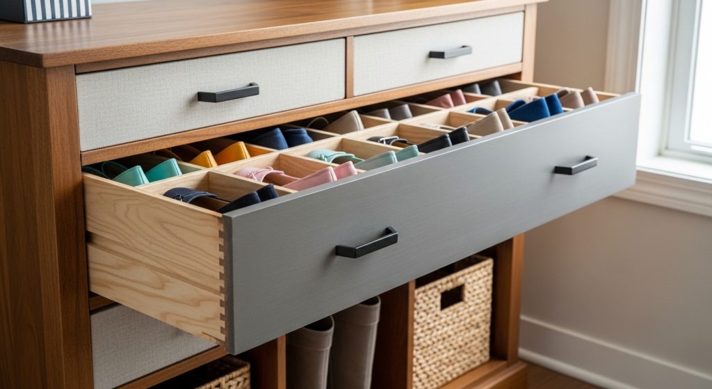 - Add Dividers: Install simple dividers made from thin craft wood or sturdy cardboard inside the drawers. Create individual compartments for each pair to keep them organized and prevent shifting.